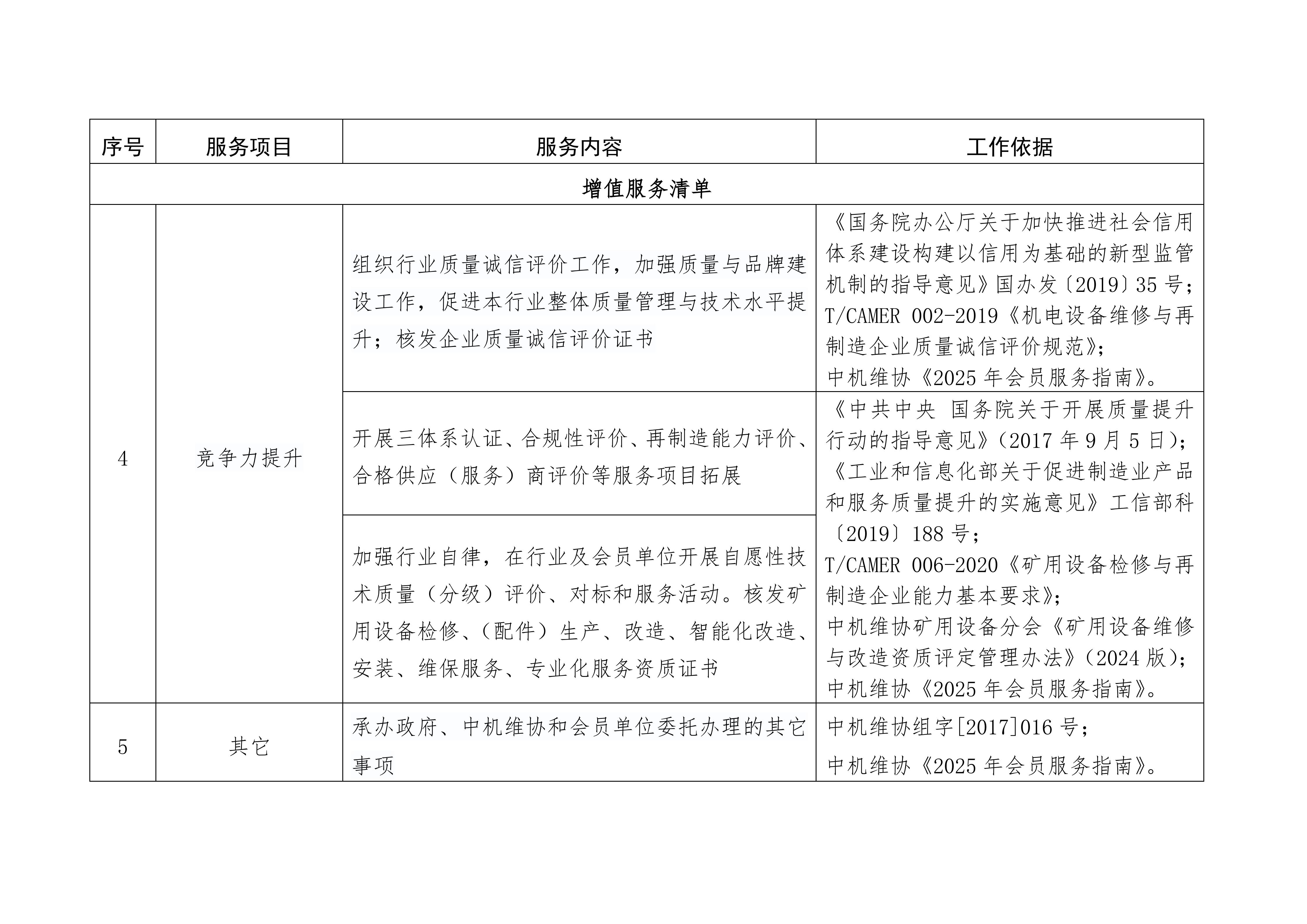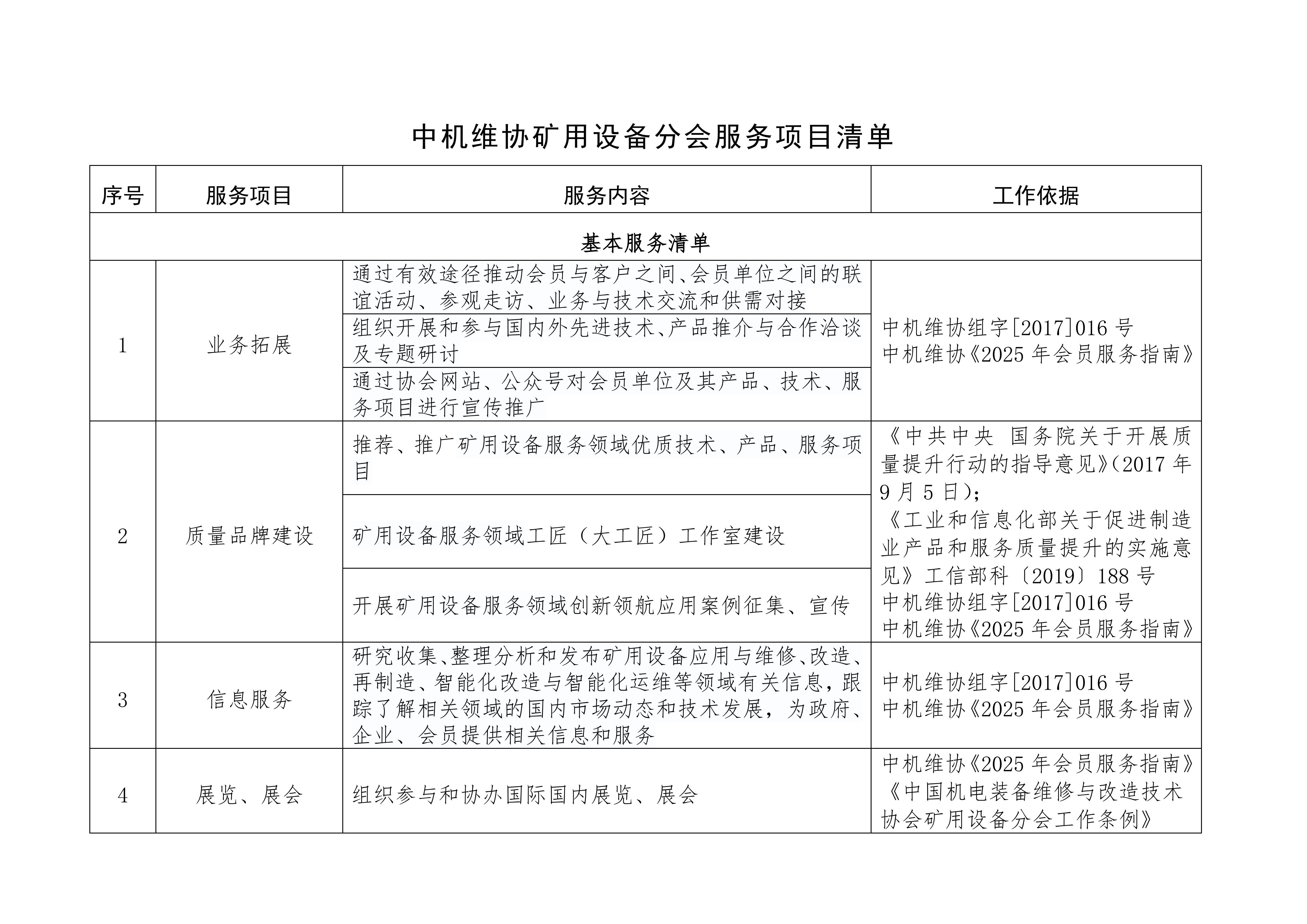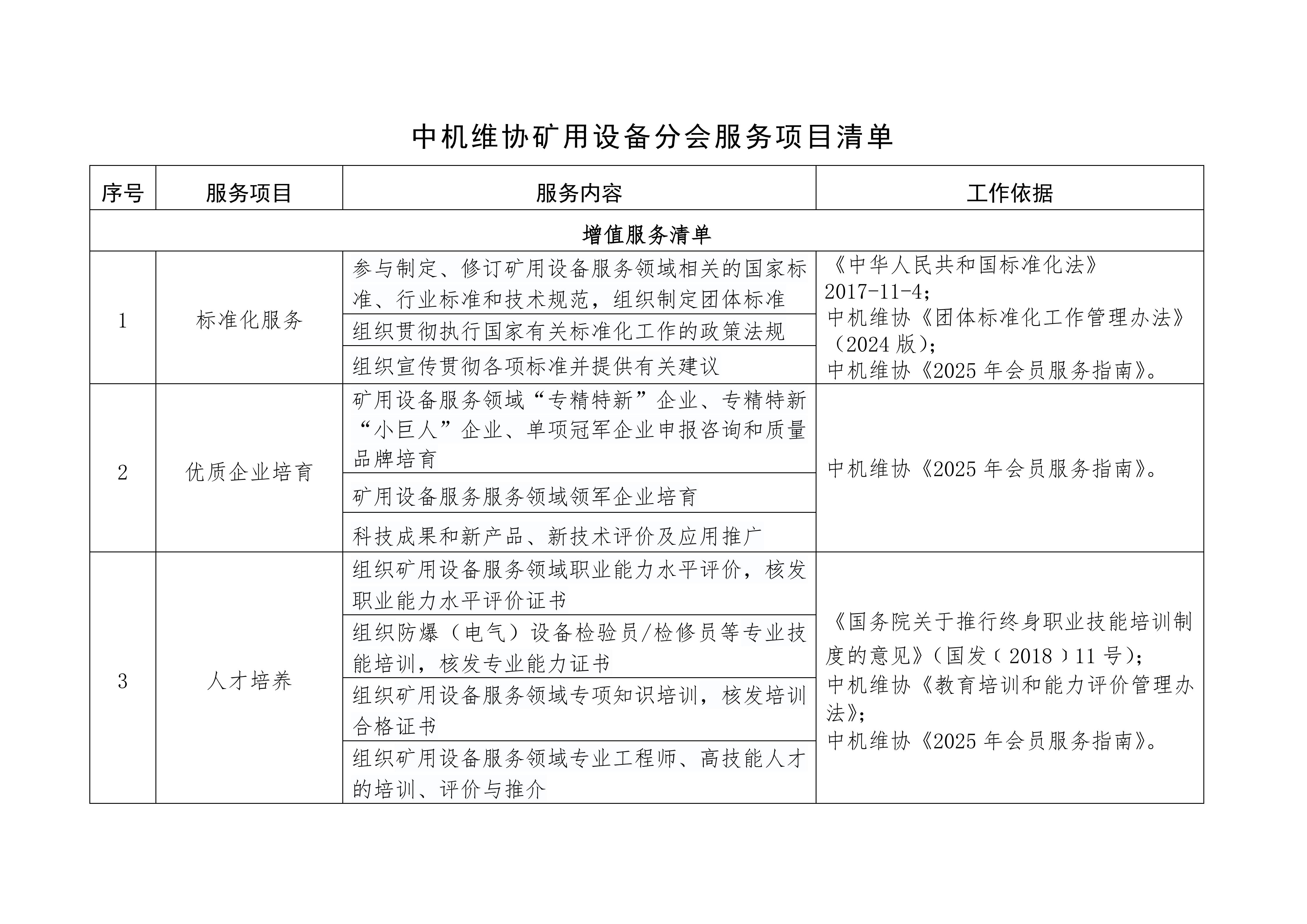 中机维协矿用设备分会服务项目清单